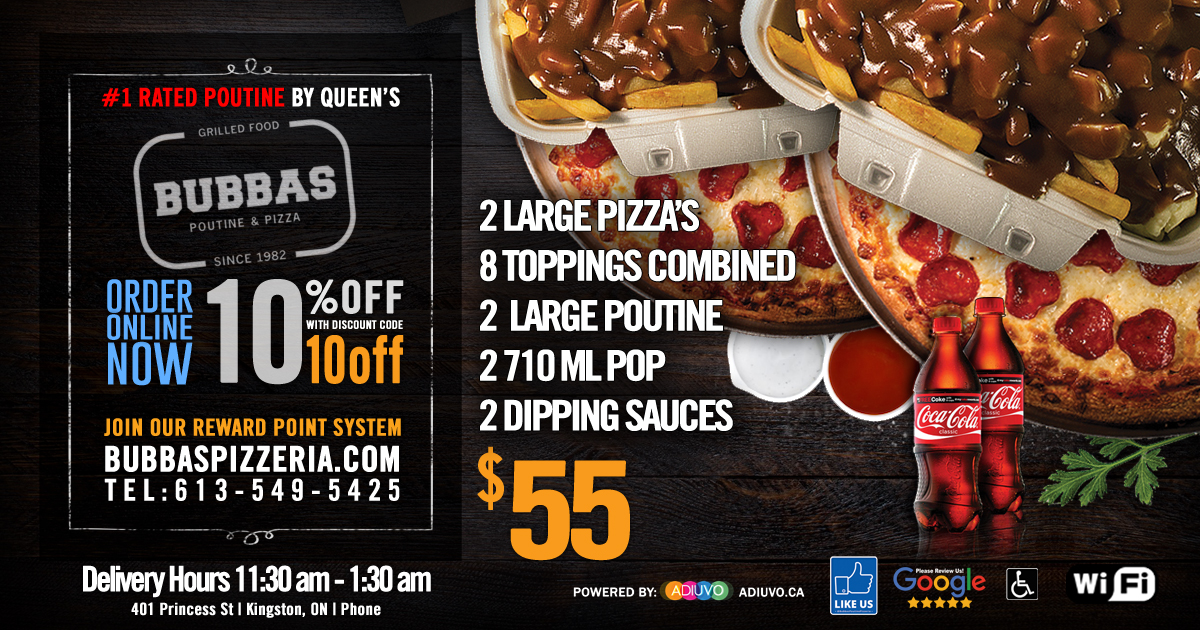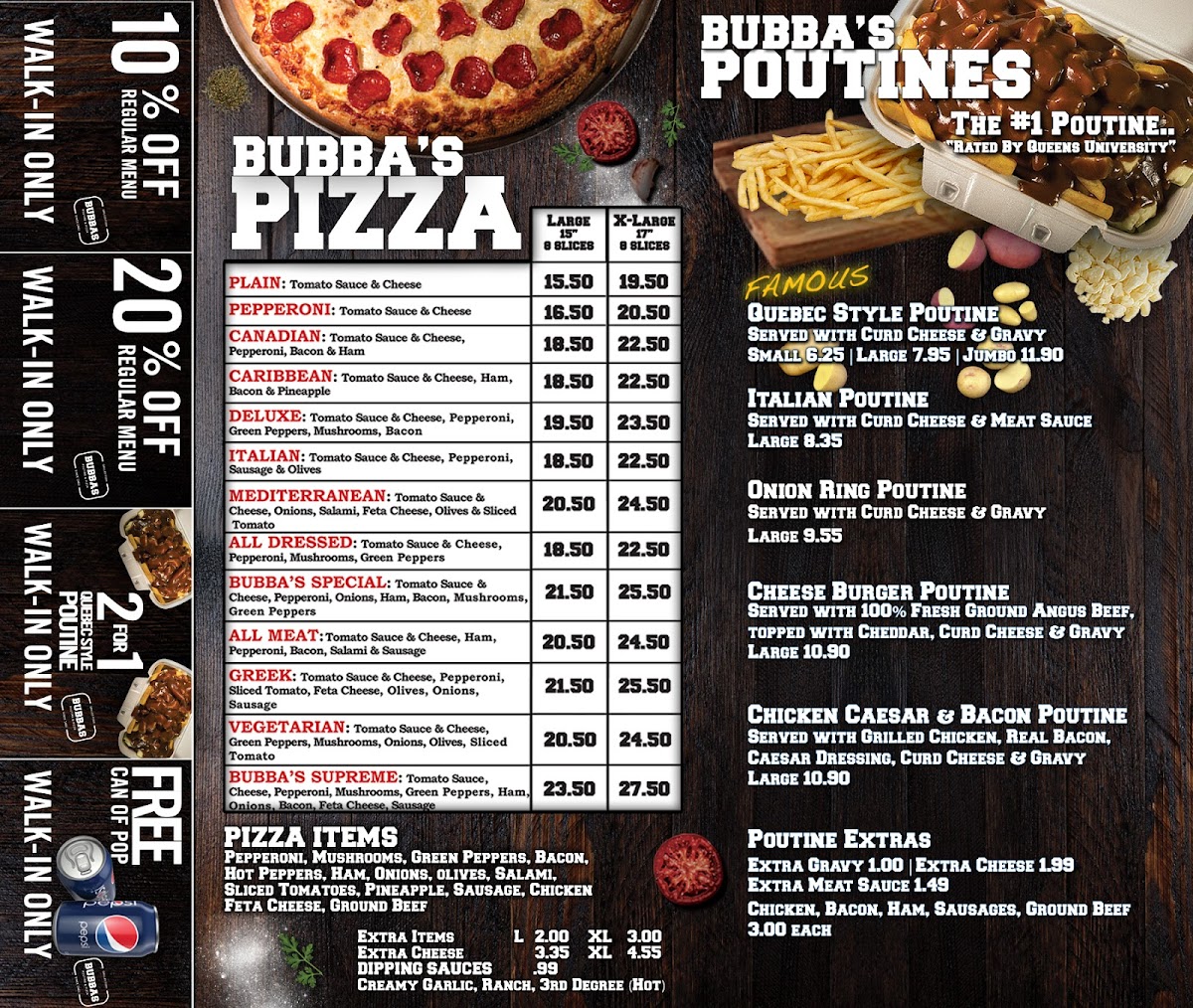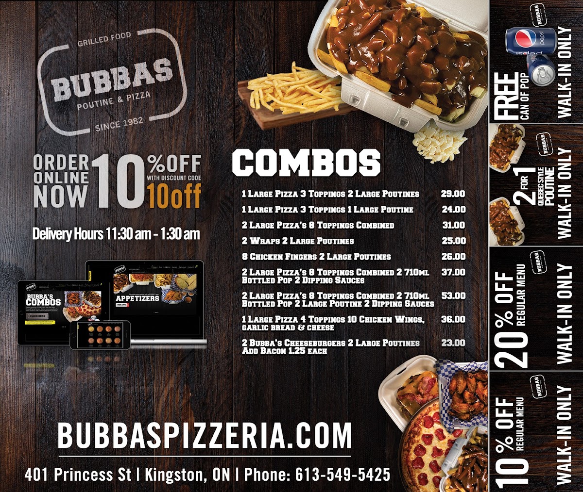 Welcome to Bubba's Poutine & Pizzeria, a cozy spot located at 401 Princess St in Kingston, ON. This spot is a must-visit for all poutine and pizza enthusiasts. With a menu boasting a variety of delicious dishes, you are sure to find something that tickles your taste buds.