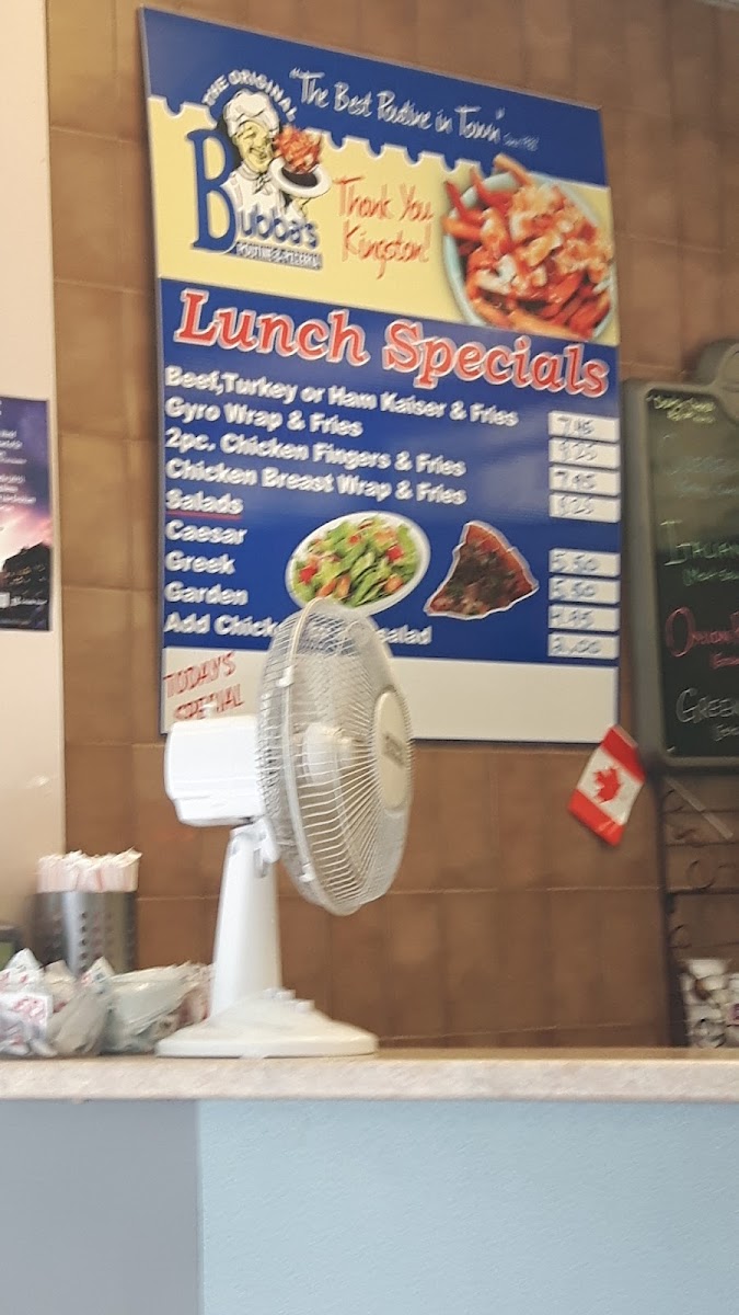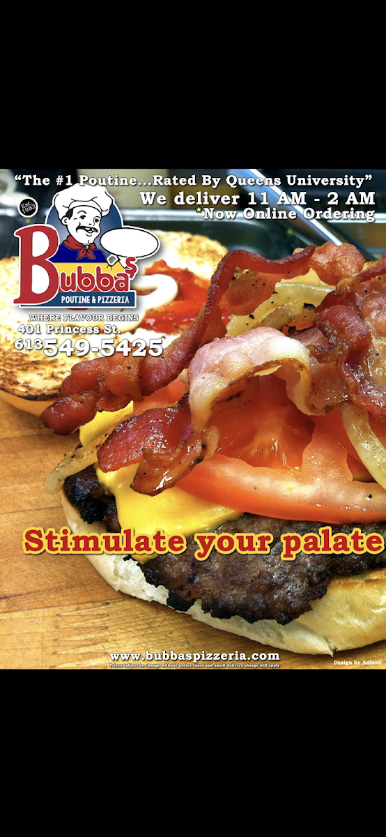 Bubba's IS THE GOTO spot in Kingston for great food, conversation and all around in general. I can't say enough about the Chicken Club wrap, a must try and the best poutine I've ever tasted in Kingston. They're pizza's are made fresh with fresh ingredients, real chunks of tomato in the sauce and the dough won't sit on you. Their burgers are amazing too. Demetre, Aresh and Jordan, to name a few of the team serve it well and personably; always a great experience going in there! Keep it up! Will DEFINITELY be there again and again.